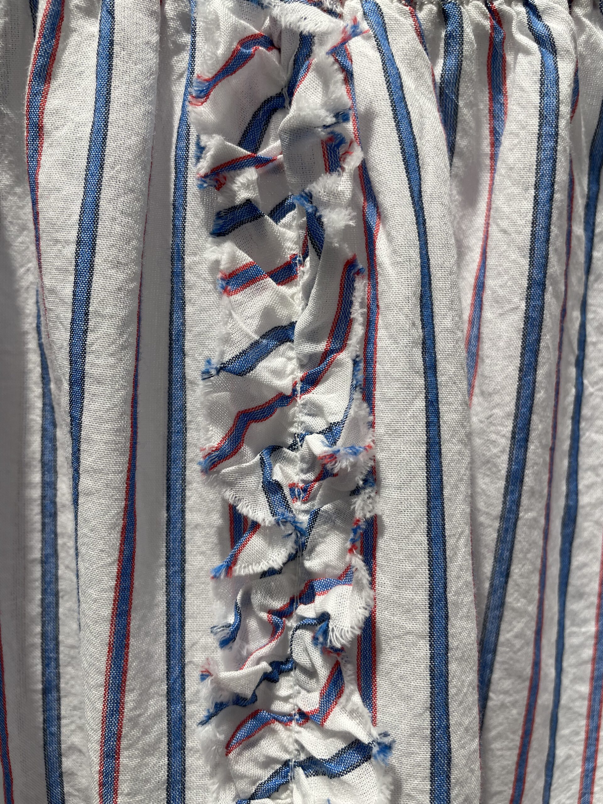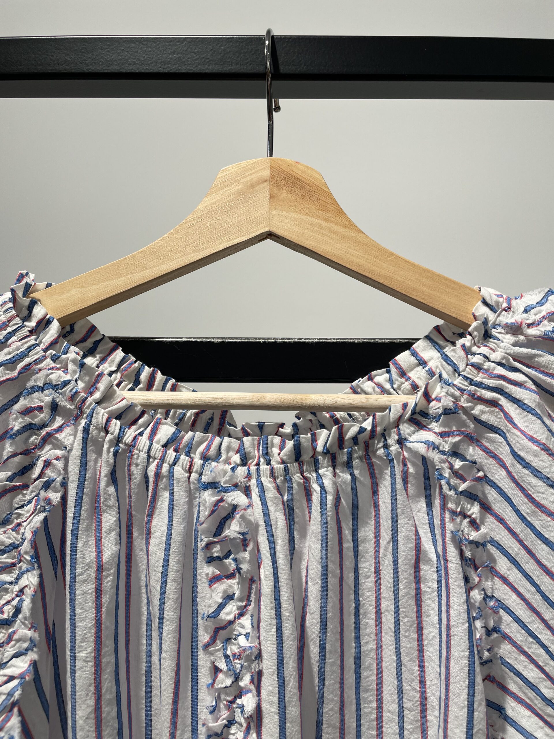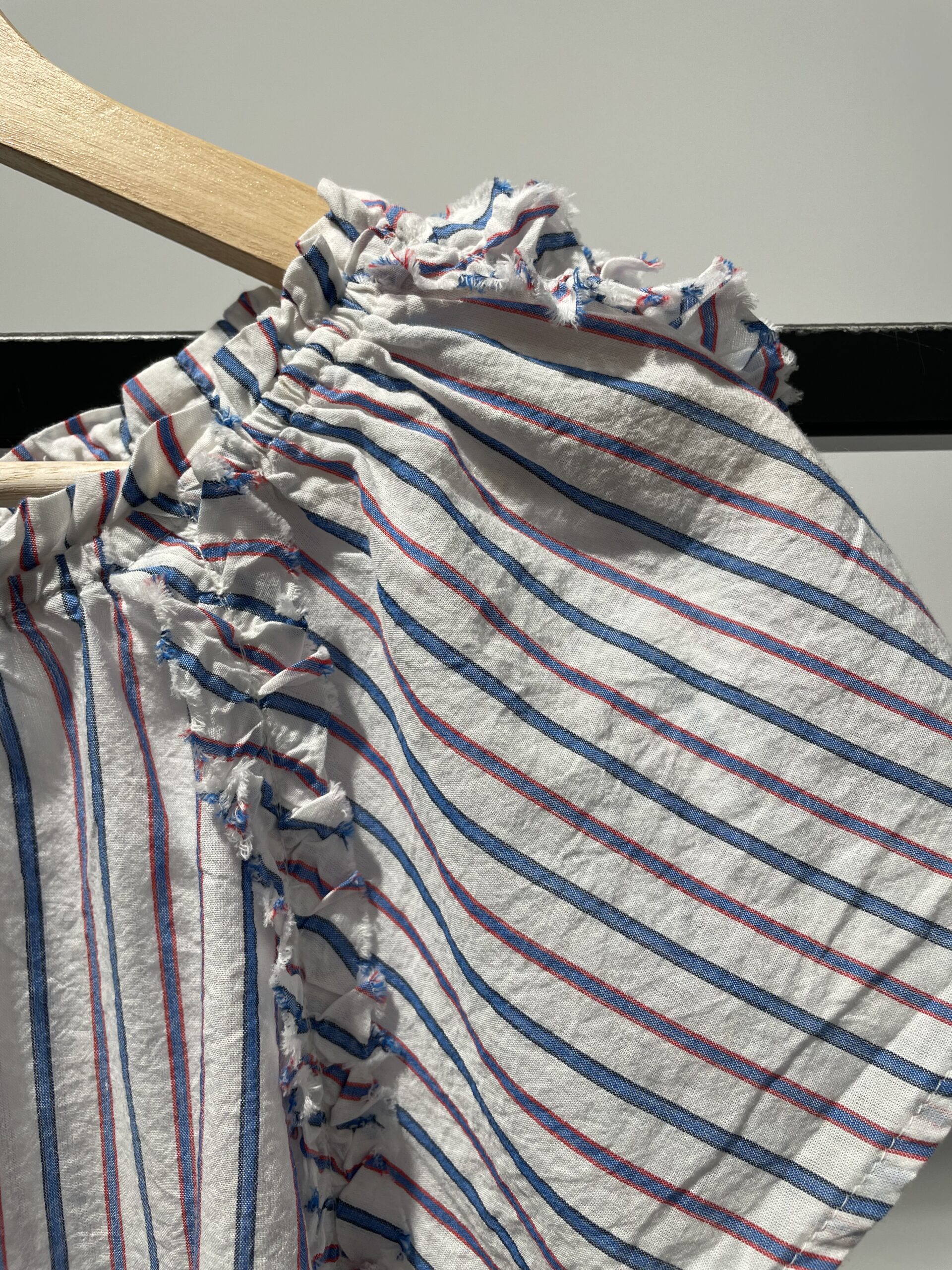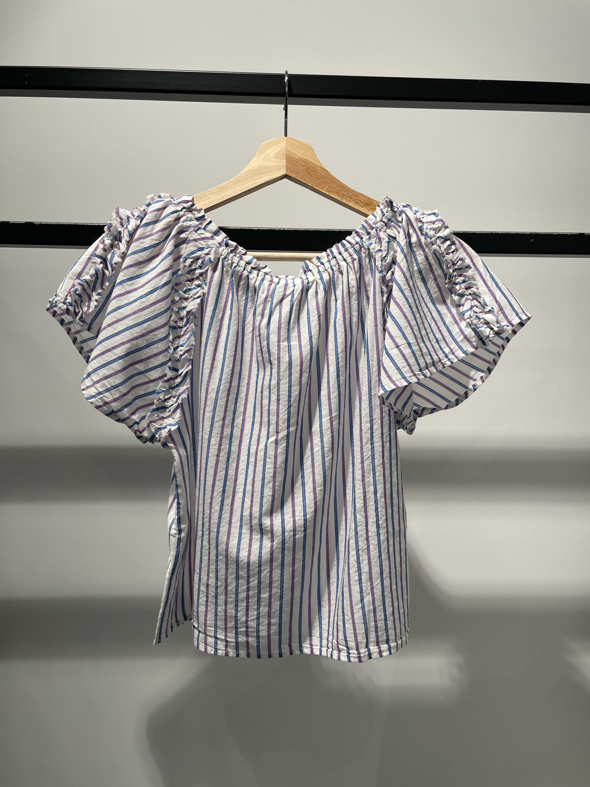 Blusa Hiera, blusa de algodón fino en rayas verticales azul, rojo y blanco, un básico marinero con un toque romántico, volantes y manga corta abierta .