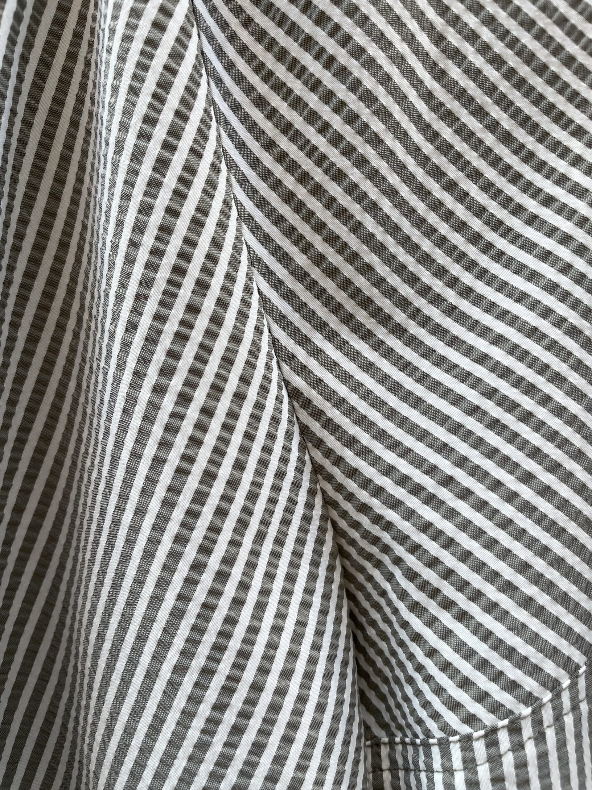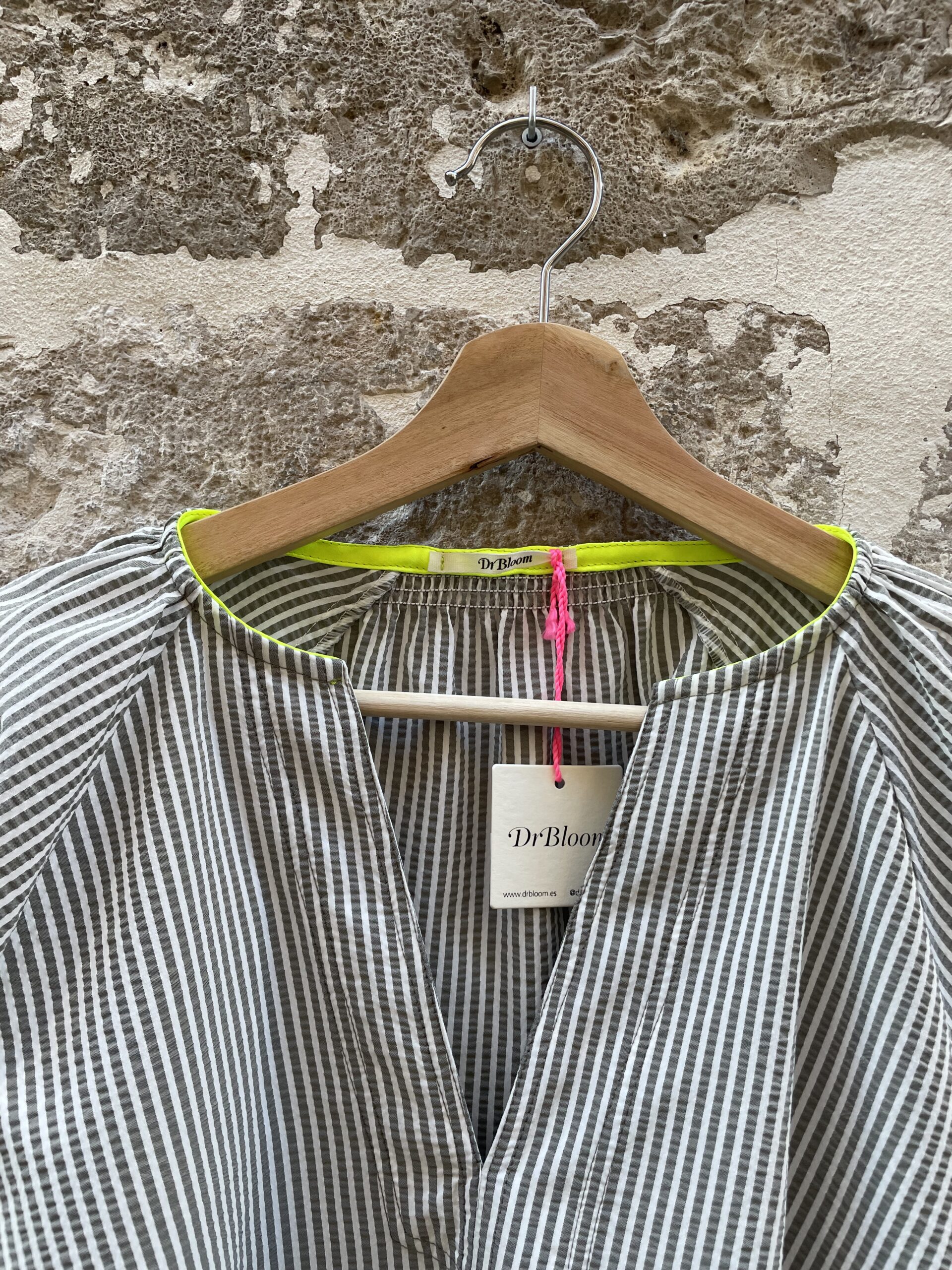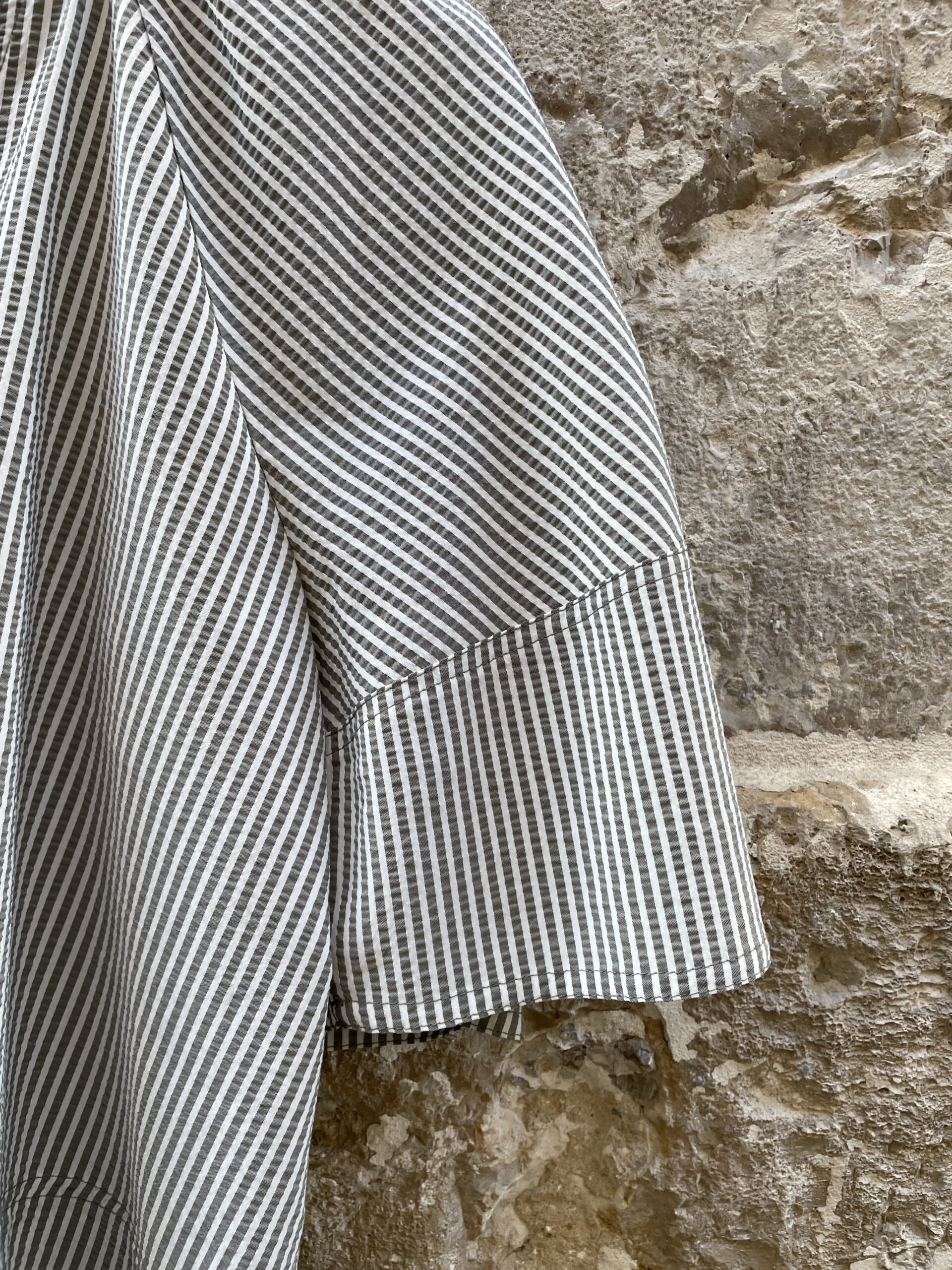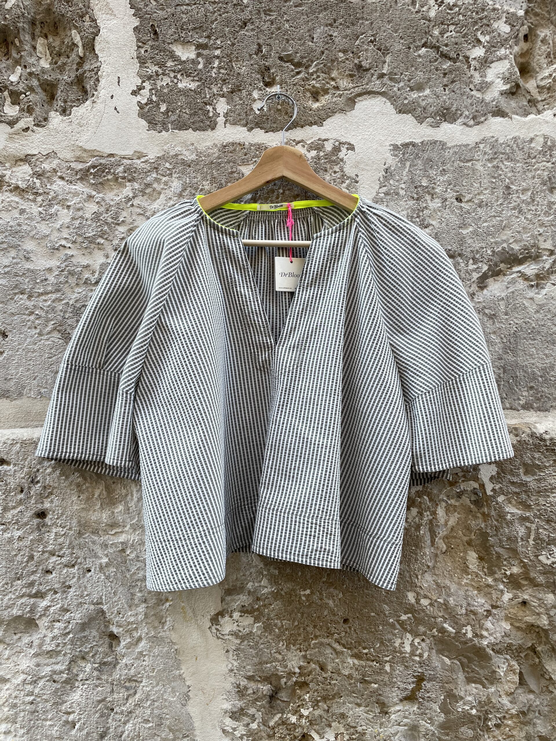 Blusa Soplo, una blusa muy amplia, con mangas anchas y forma de campaña, escote abierto y rayas verdes y blancas finas, que la hacen una blusa muy especial 😜