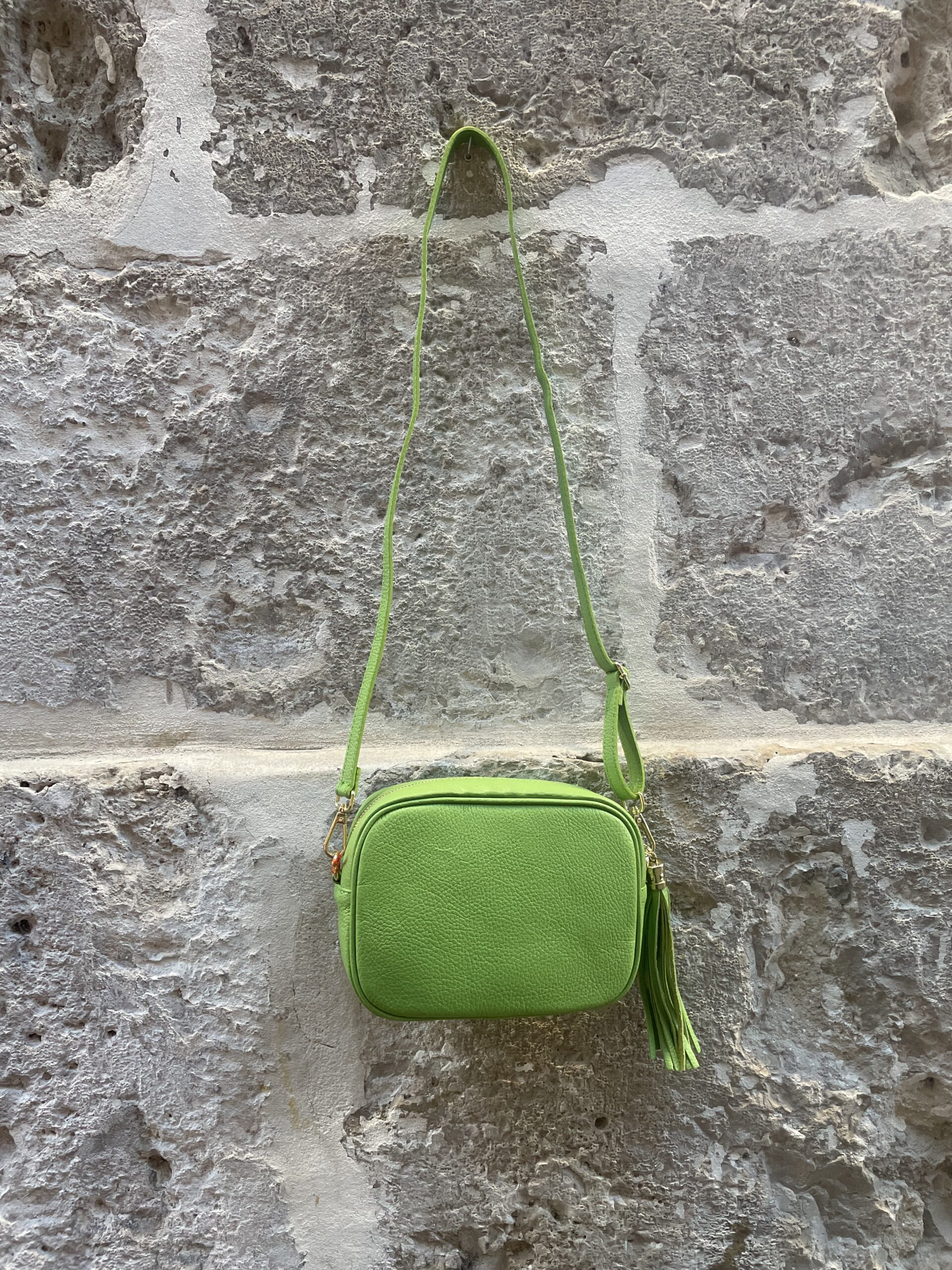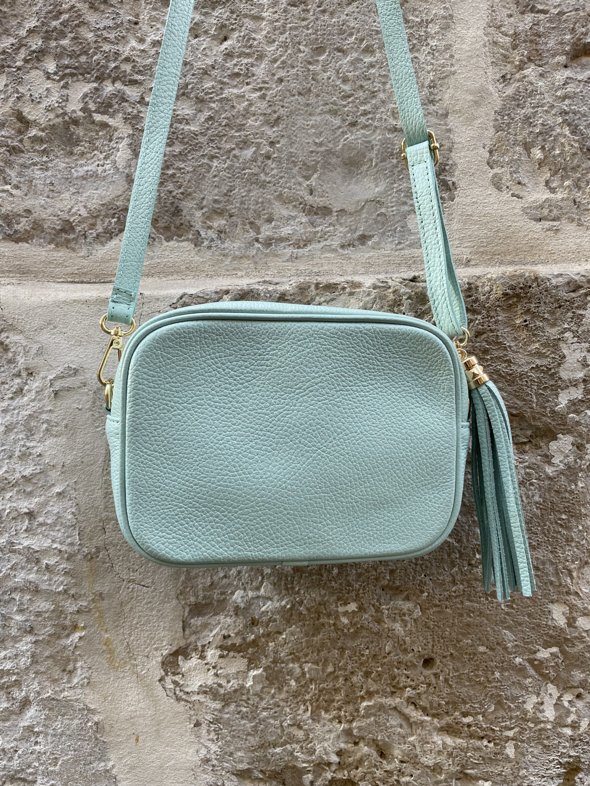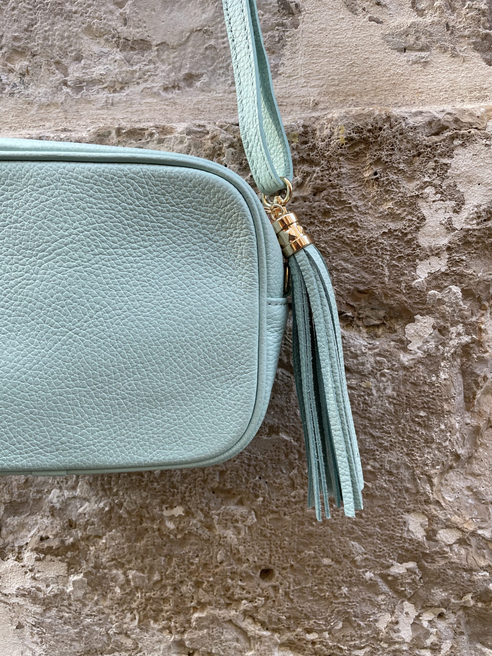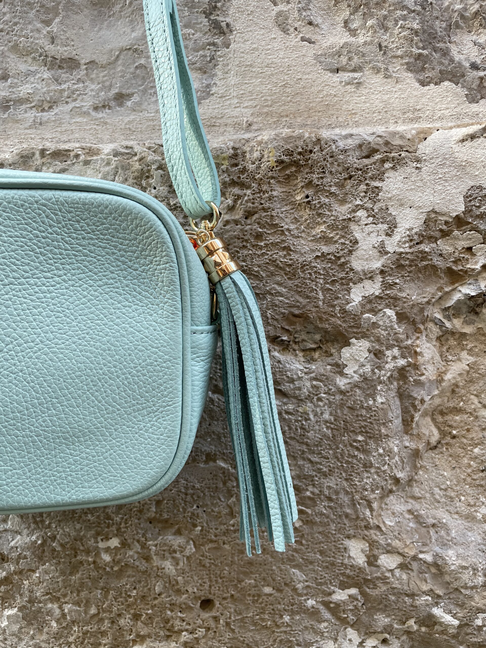 Bolso de piel en tonos ideales con borla en el mismo color y detalles dorados. Es un bolso cuadrado, con buena capacidad que no pesa apenas, lo justo para llevar todos tus imprescindibles y dar un toque de color a tus estilismos.