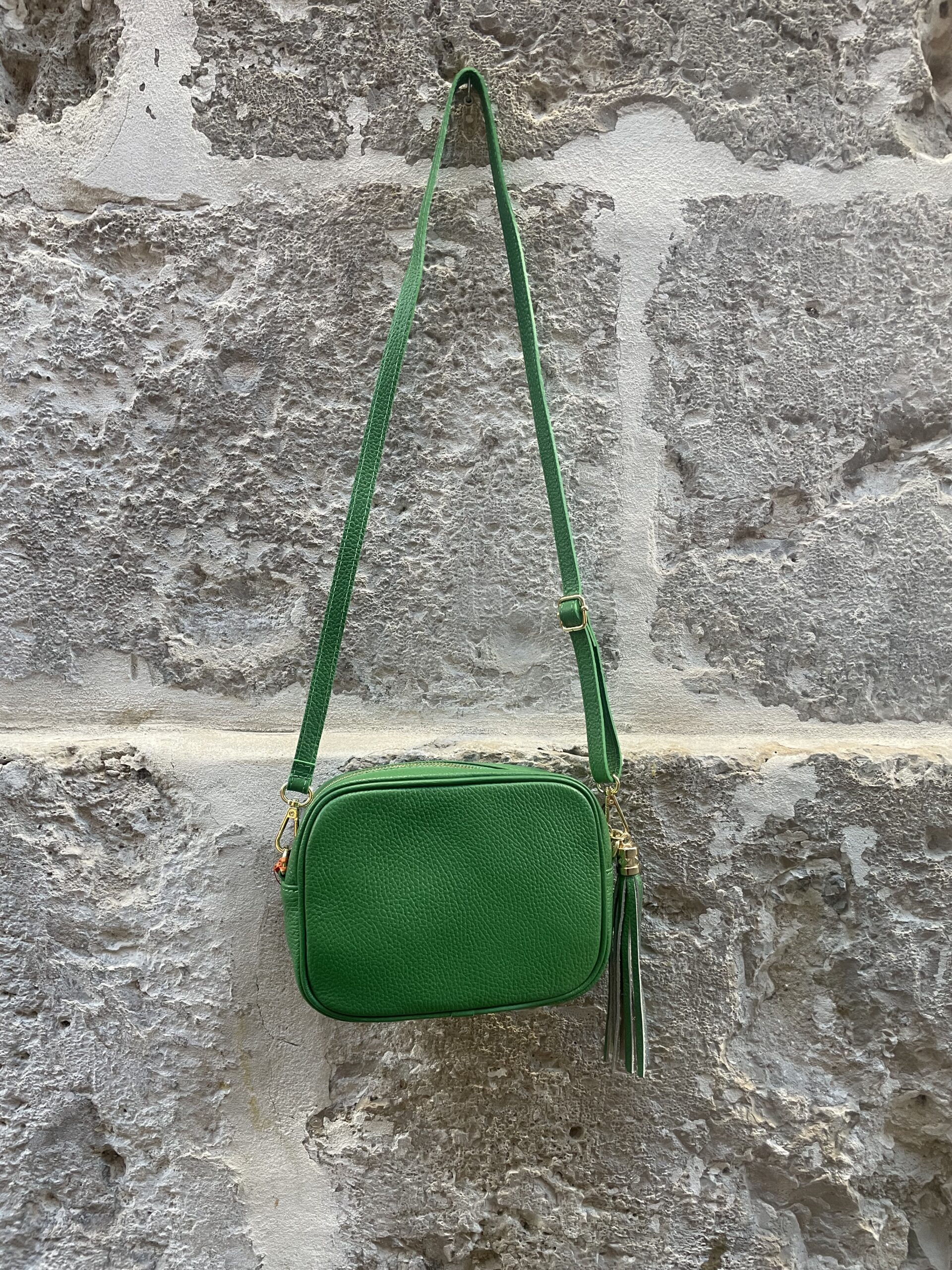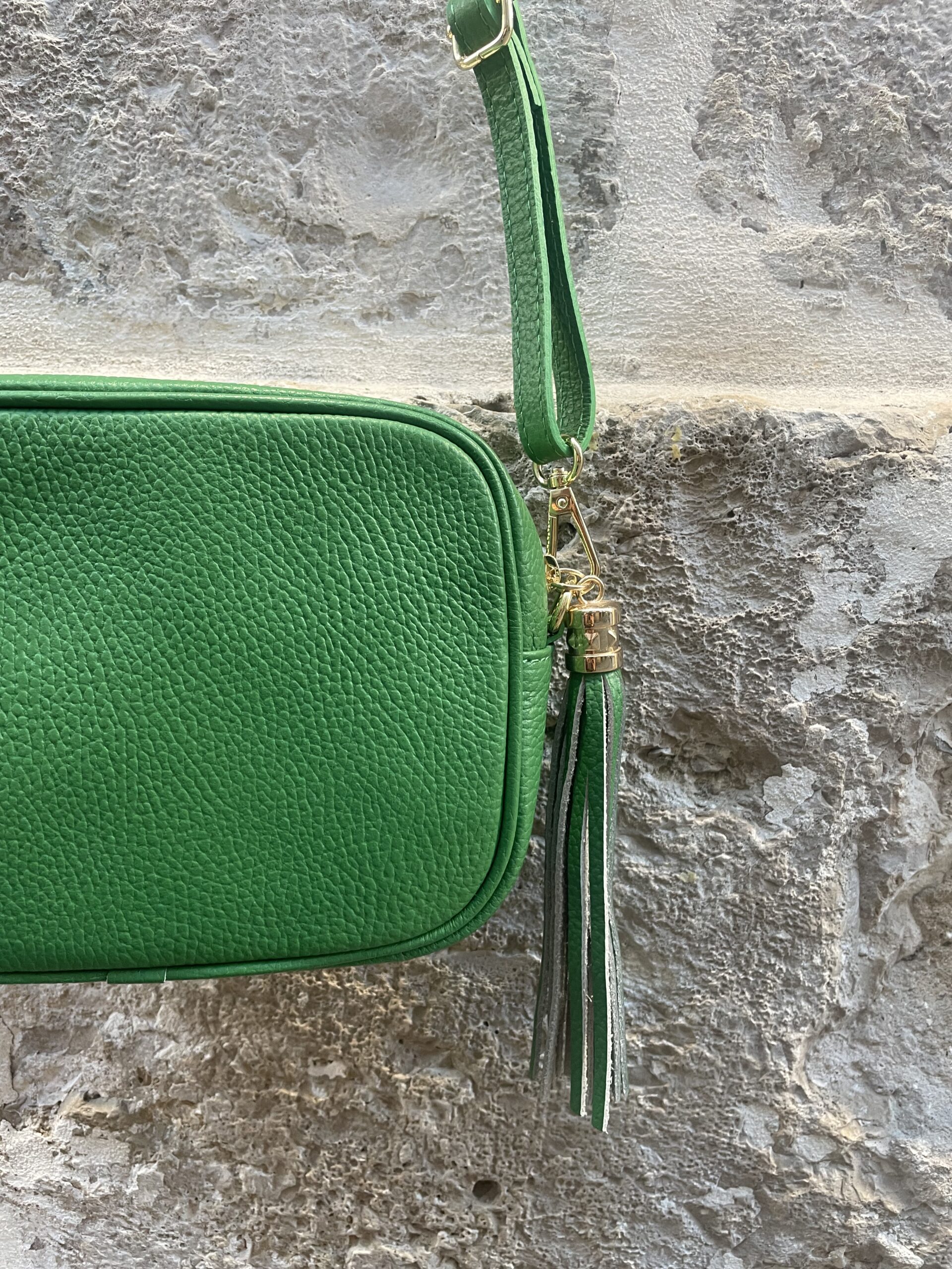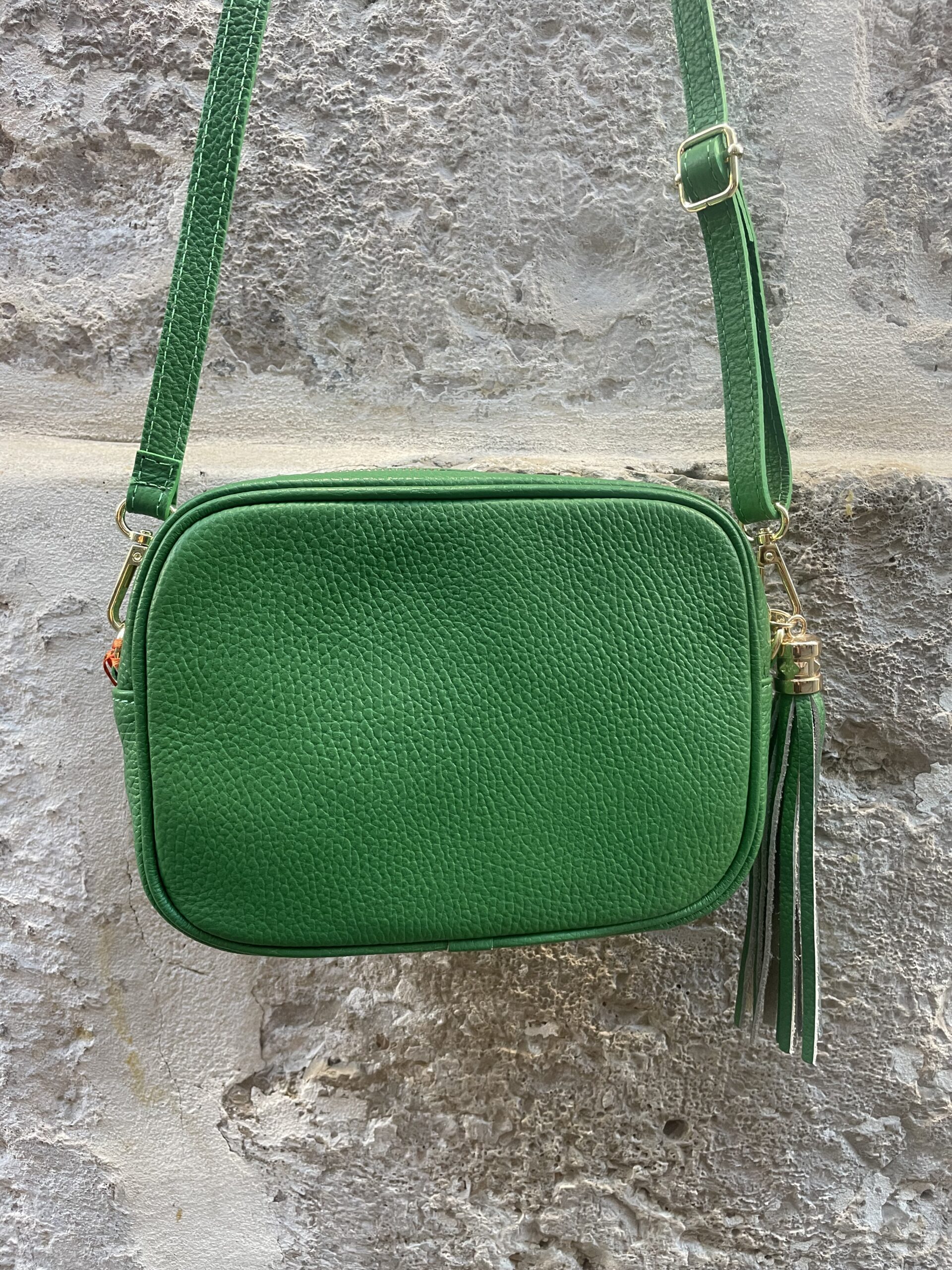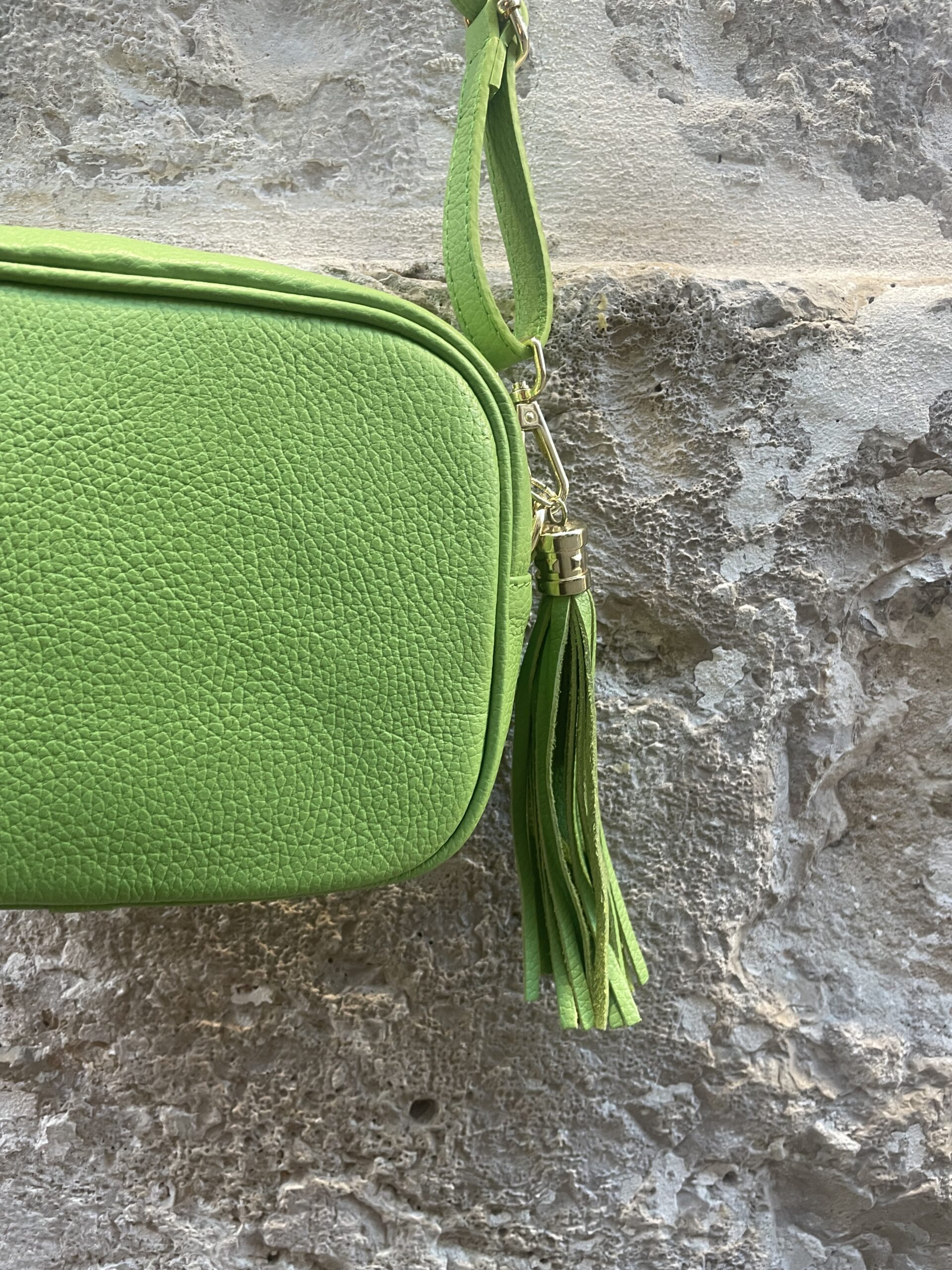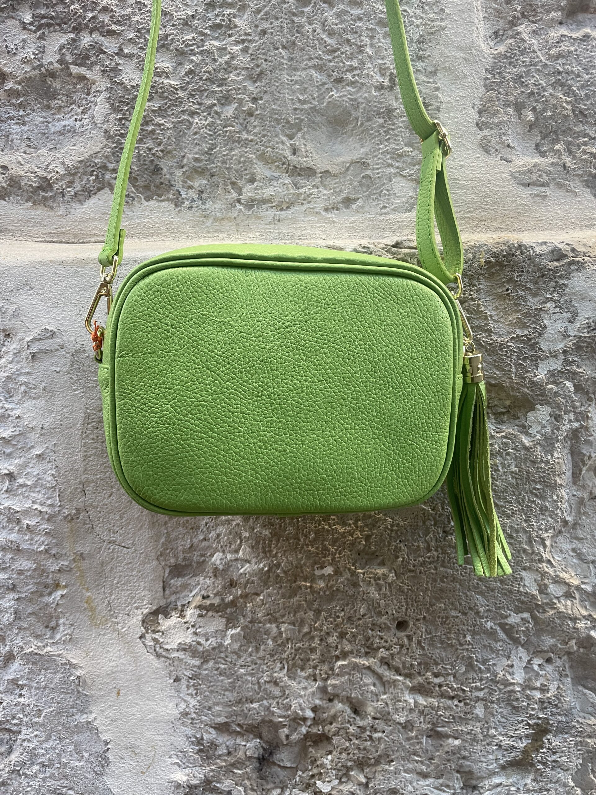 Bolso de piel en tonos ideales con borla en el mismo color y detalles dorados. Es un bolso cuadrado, con buena capacidad que no pesa apenas, lo justo para llevar todos tus imprescindibles y dar un toque de color a tus estilismos.