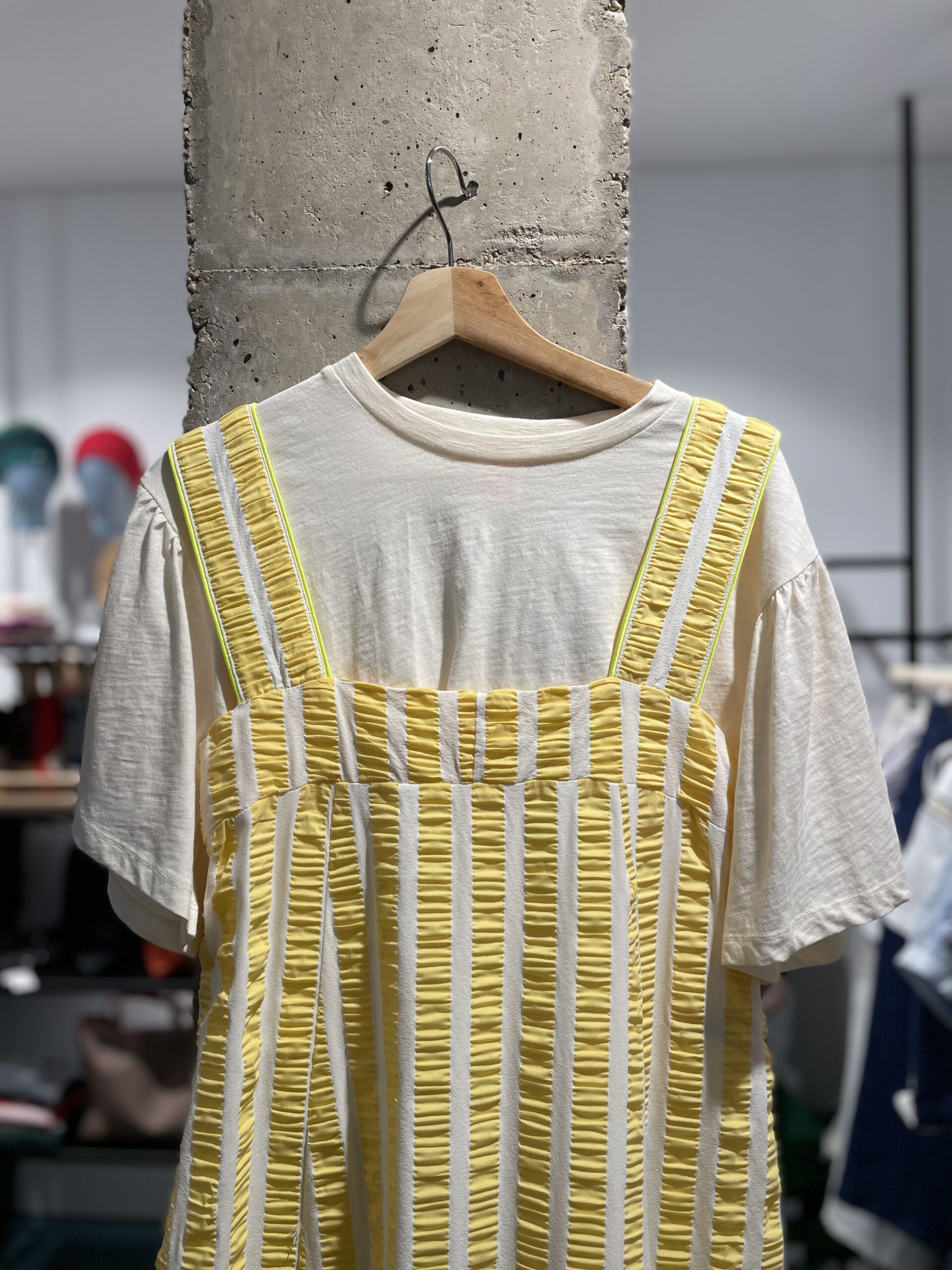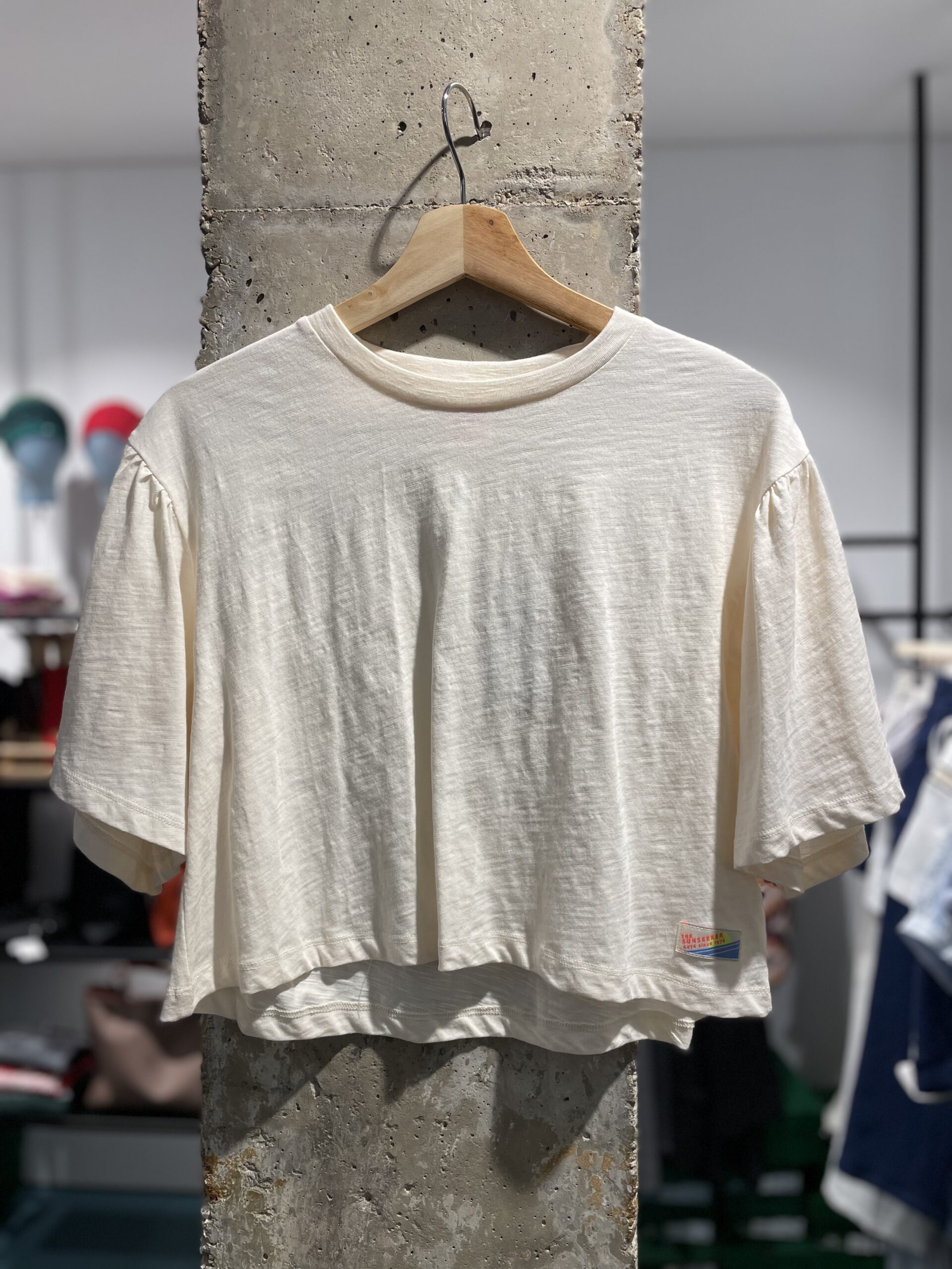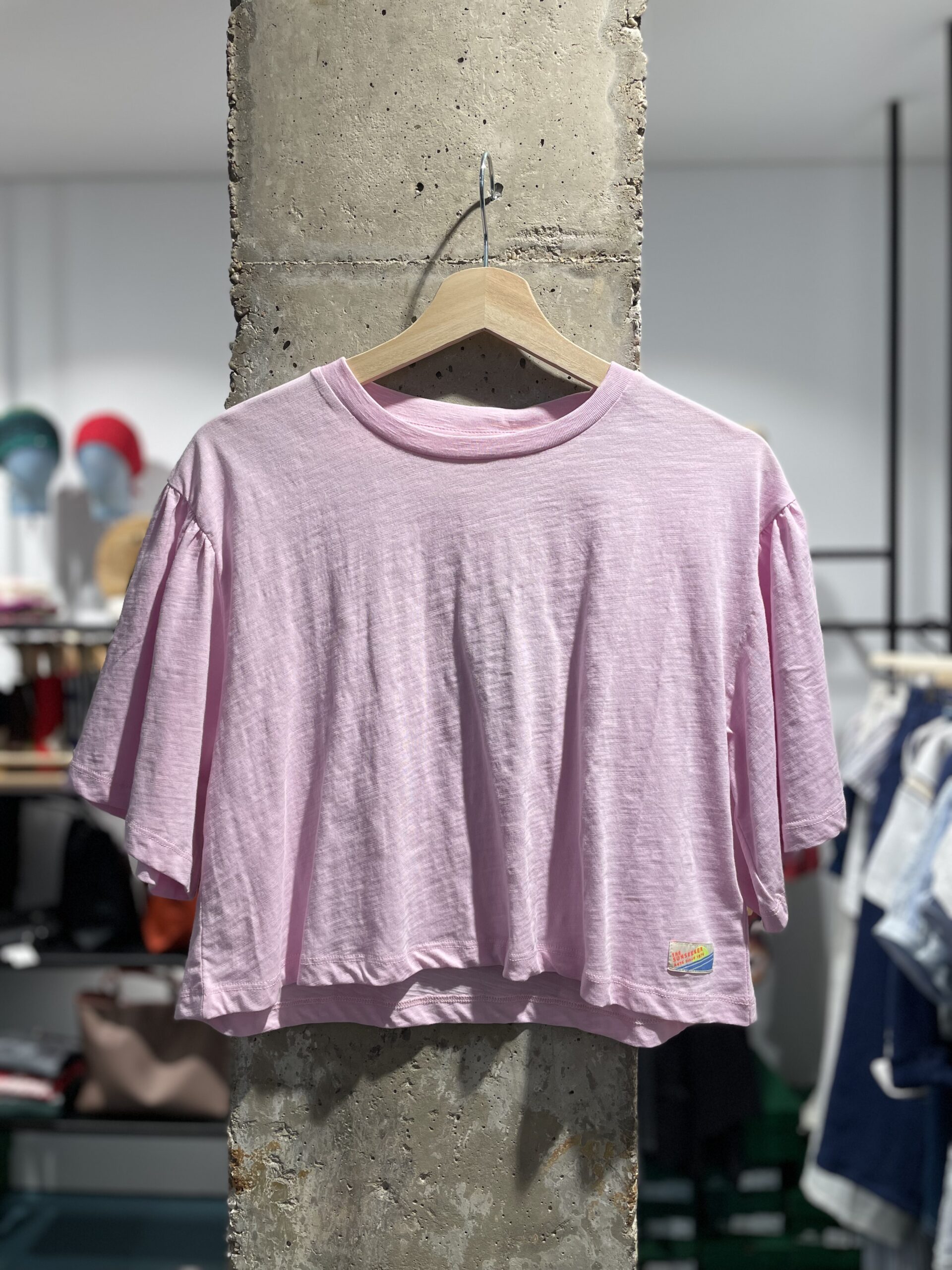 Camiseta Arbi, una camiseta 100% algodón, crop y oversize, manga con vuelo y estilazo maximo en tono rosa bebé y vainilla.