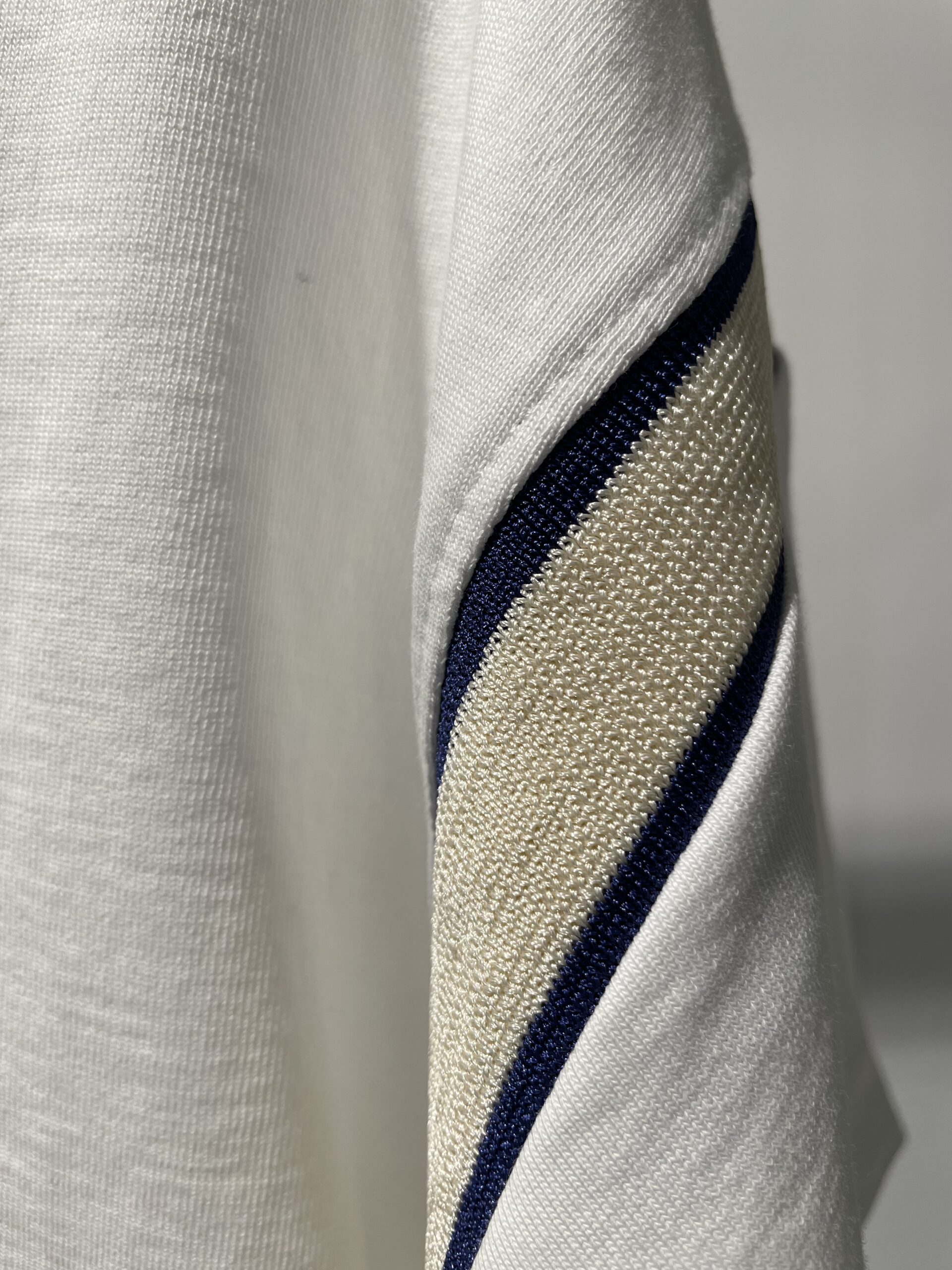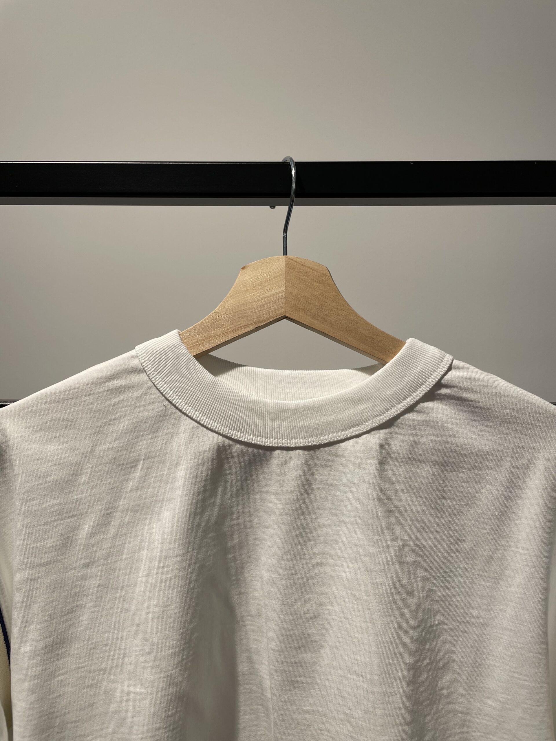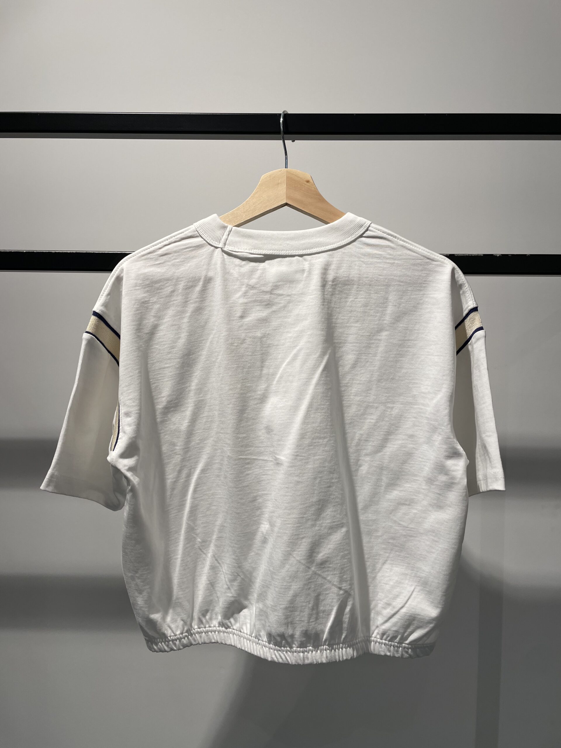 Camiseta de algodón con elástico en la cintura, cuello ancho y manga ranglan, detalle de punto en azul marino y beige en la costura de las mangas.