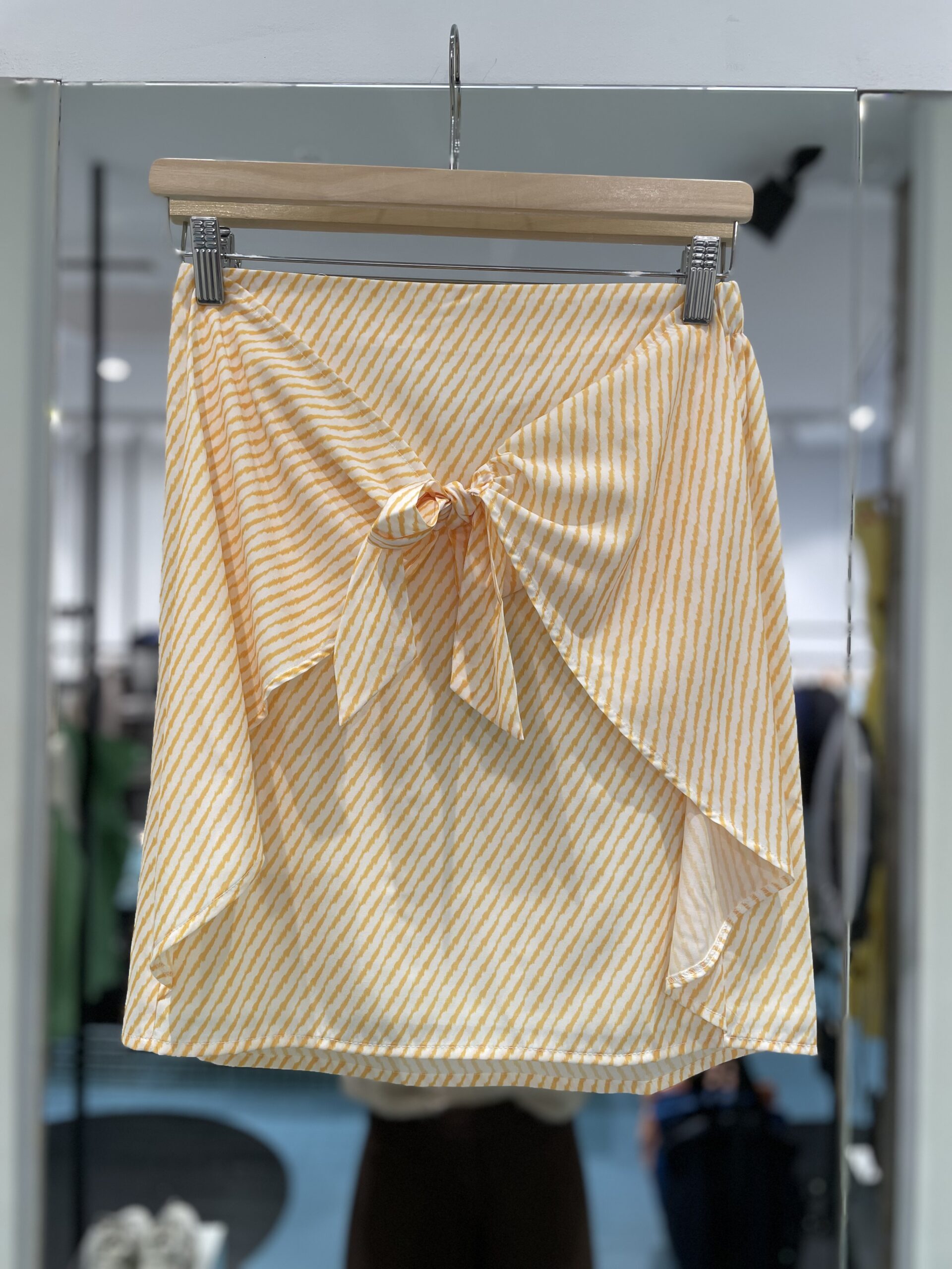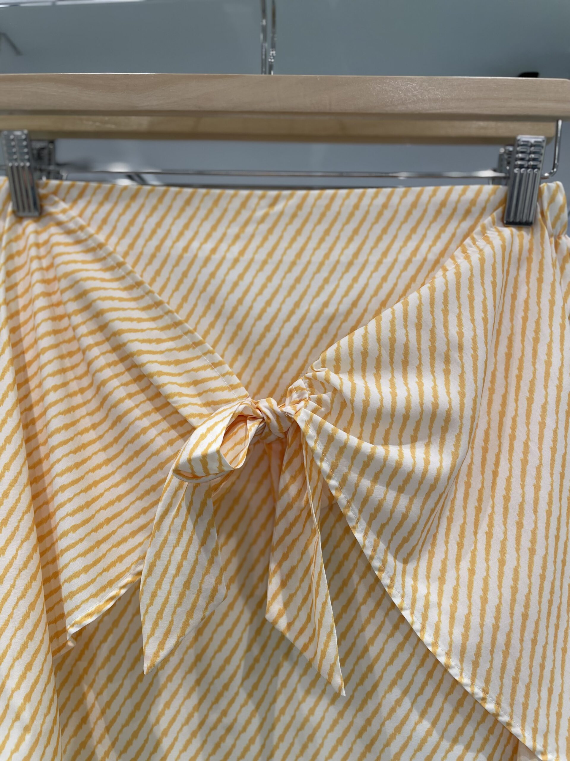 Falda mini pareo nudo frontal en popelin, un tejido suave y fresco, con rayas amarillas y blancas, ideal para las tardes de primavera. Tienes a conjunto la blusa. 😍