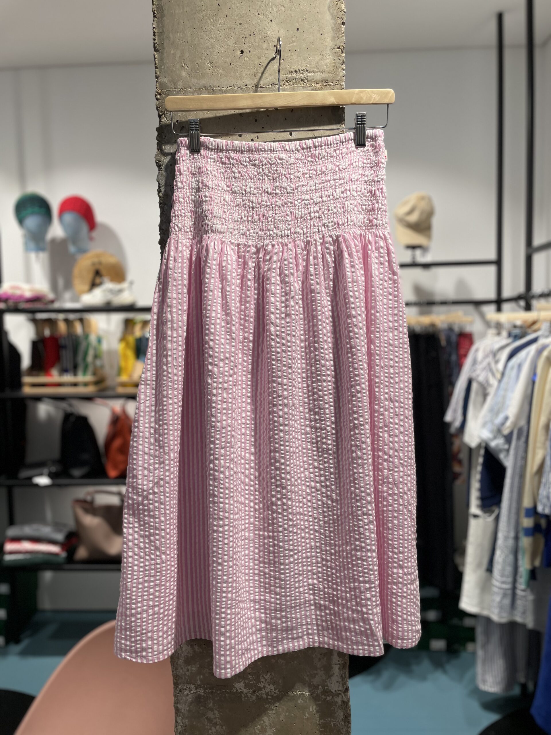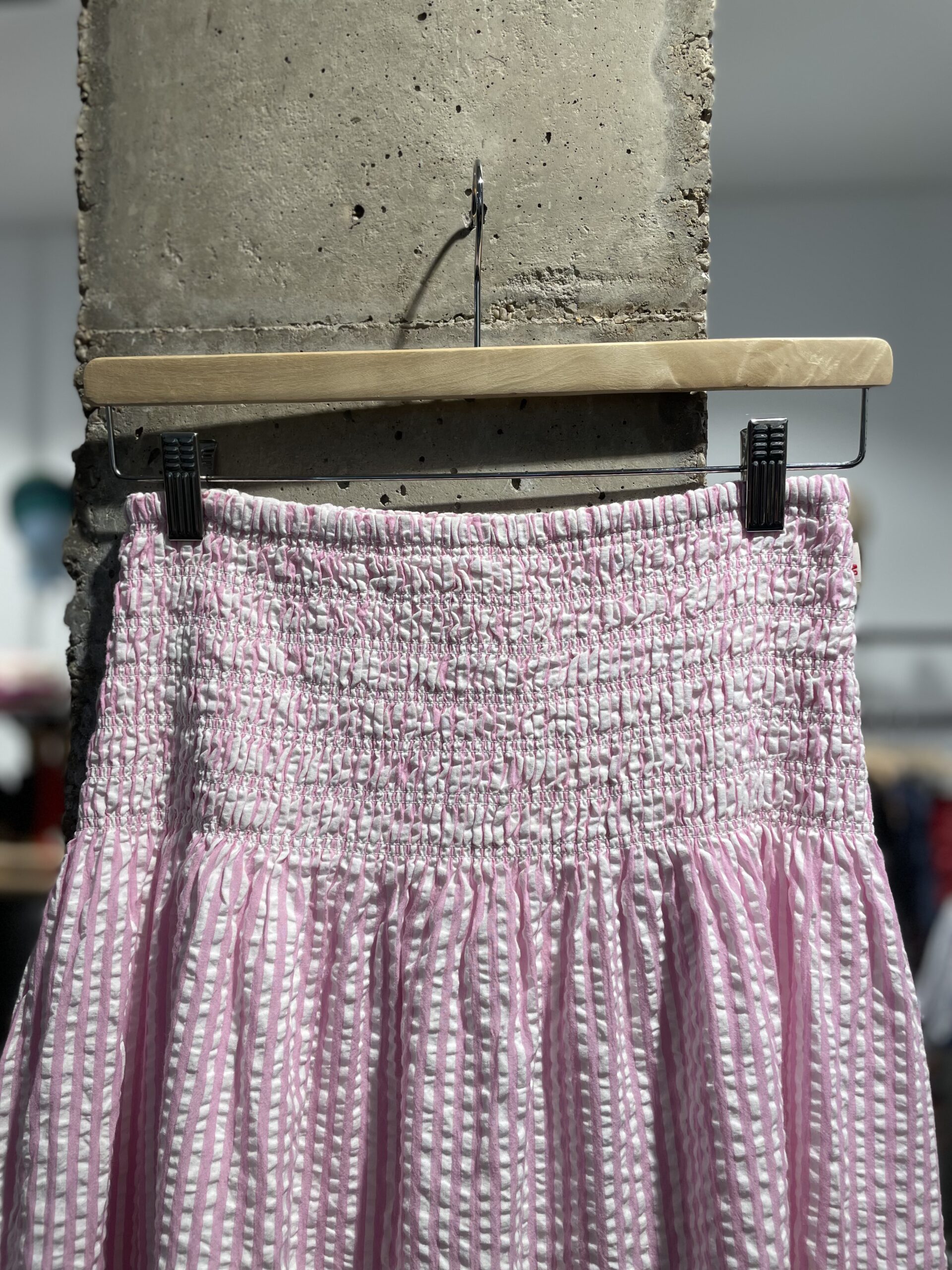 Falda de rayas rosas y blancas, en 100% algodón tipo bambula, forrada. Cinturilla engomada que se ajusta perfectamente a la cintura y vuelo ligero 🩷