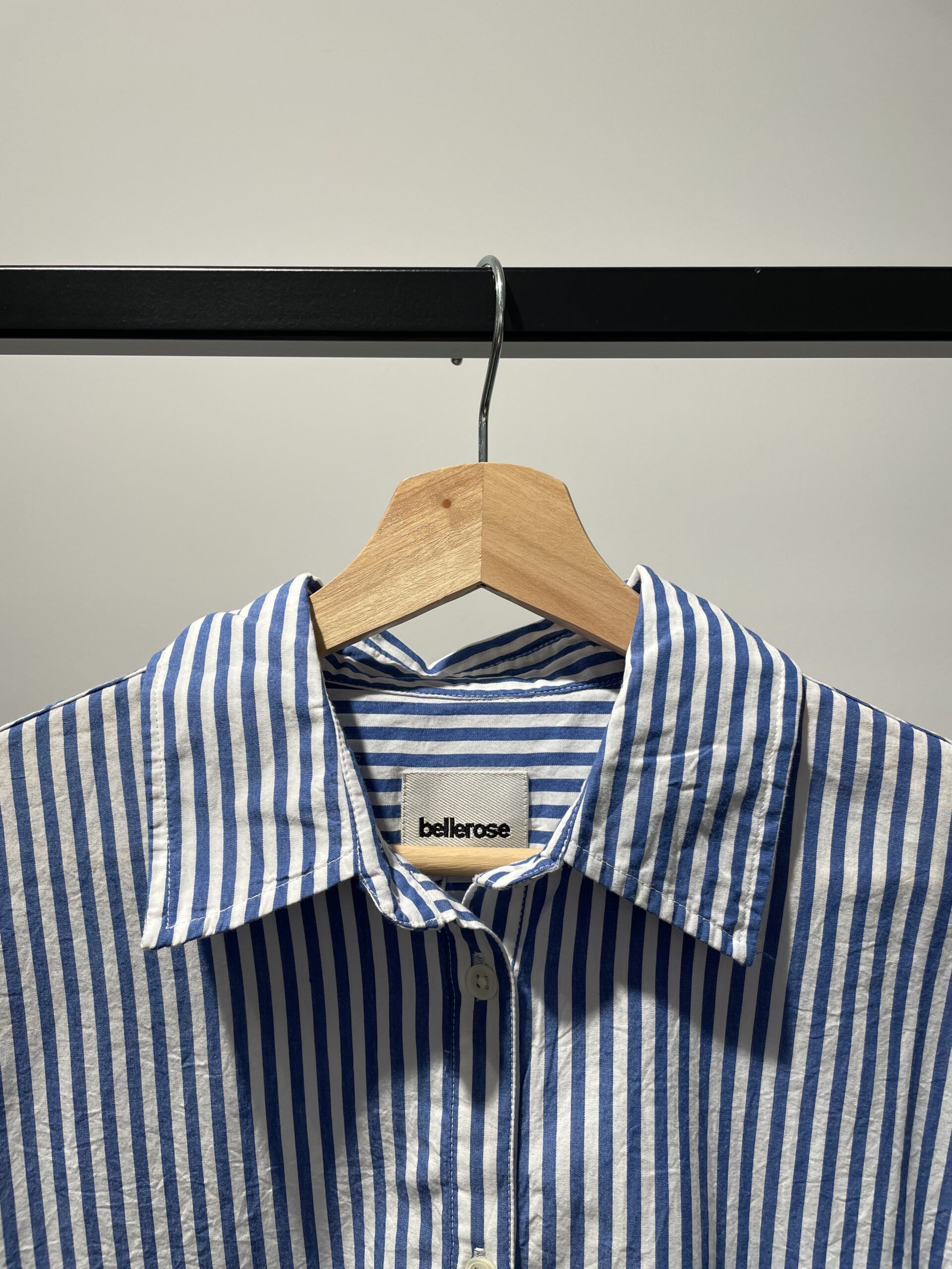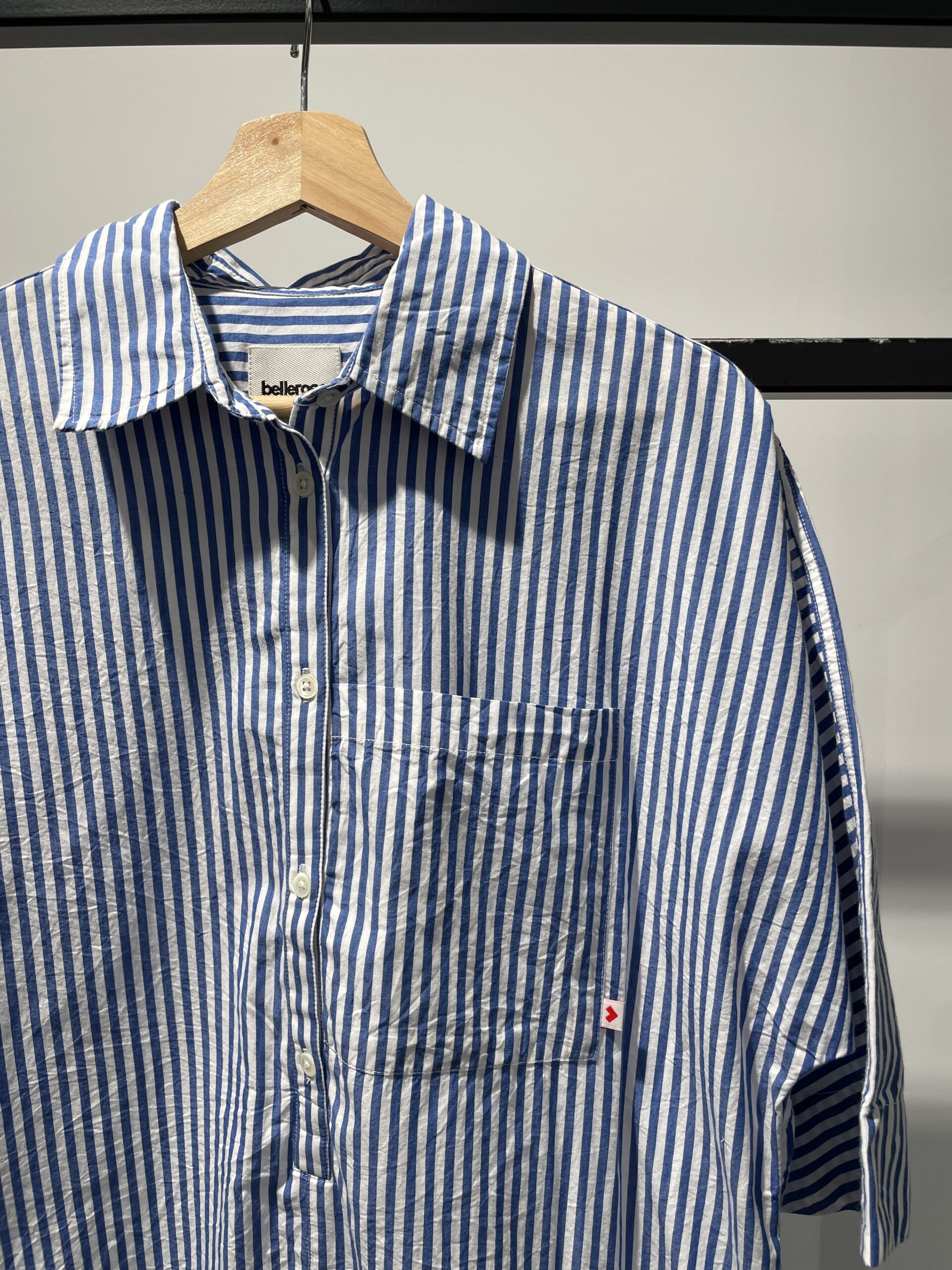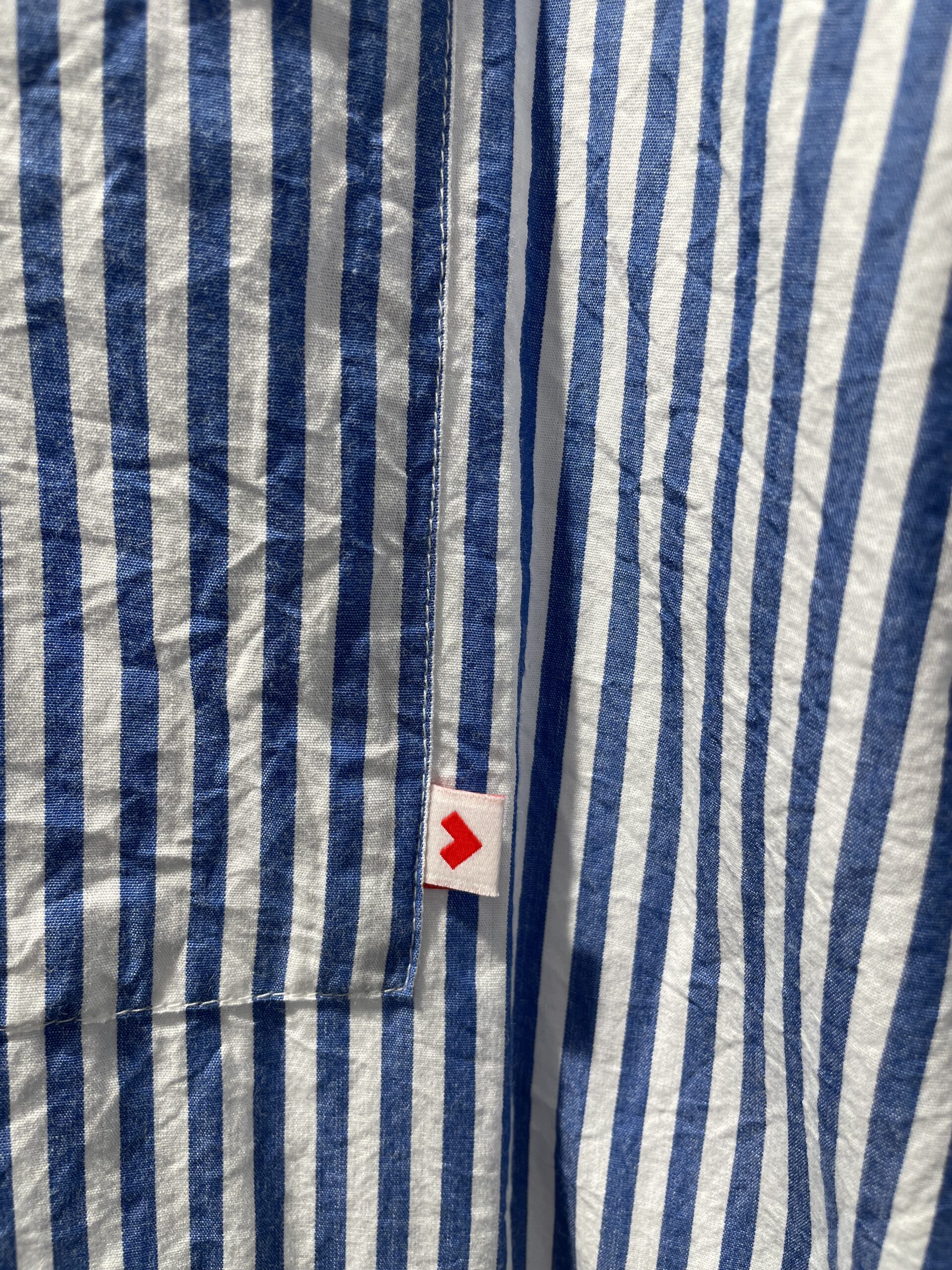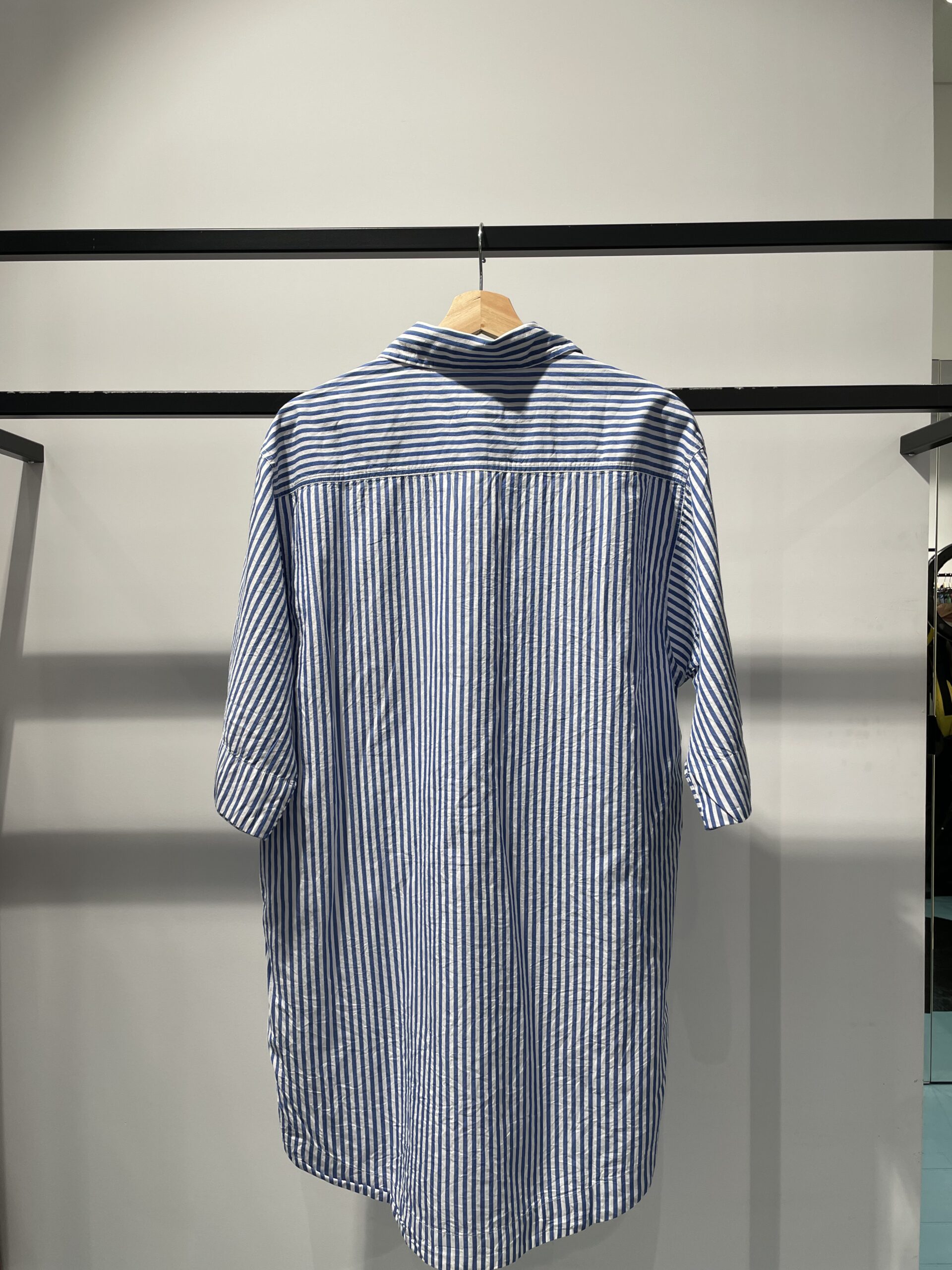 Vestido camisero de rayas azul klein y blanco, manga al codo, abotonadura hasta la cintura y bolsillo frontal.