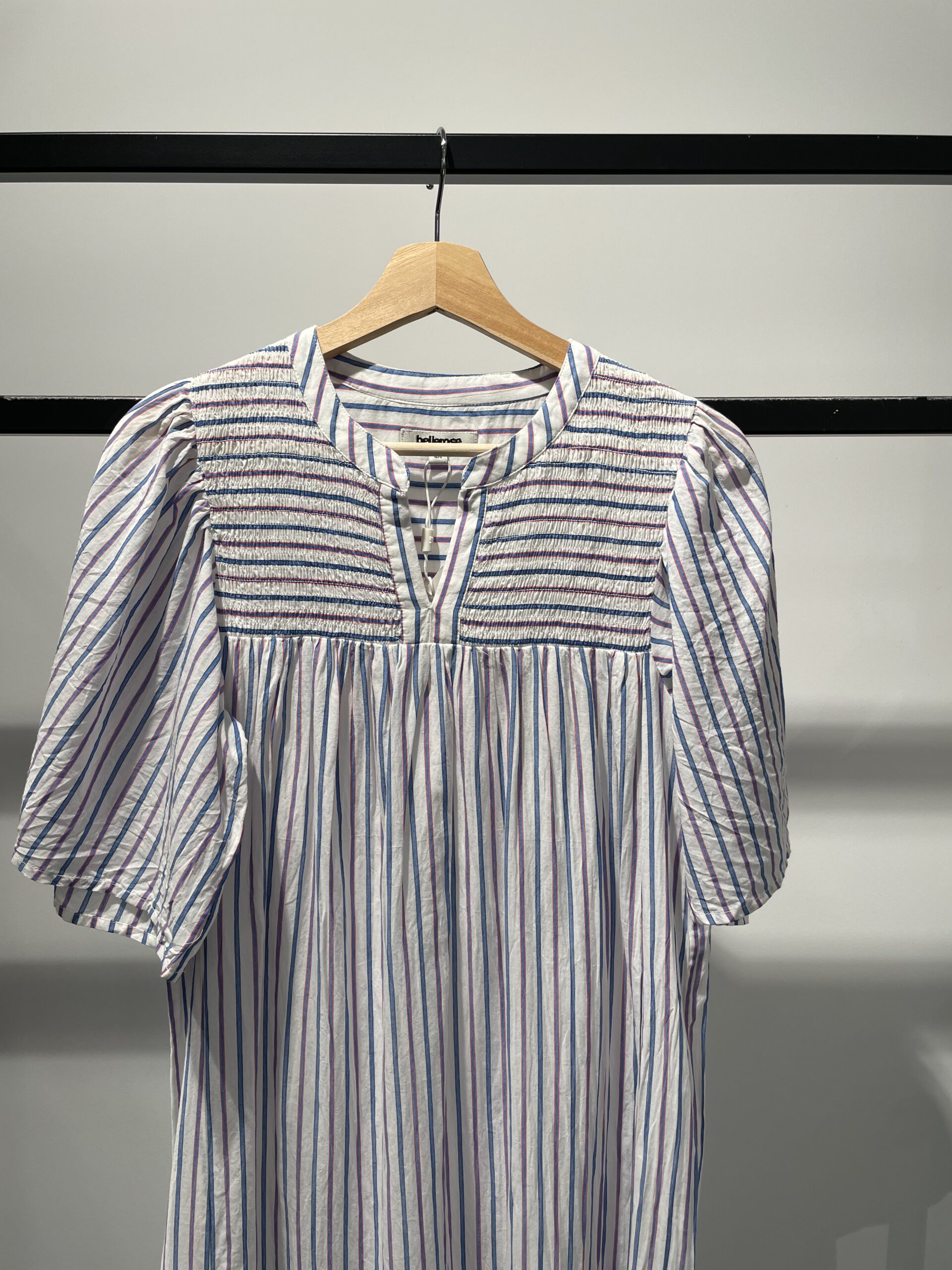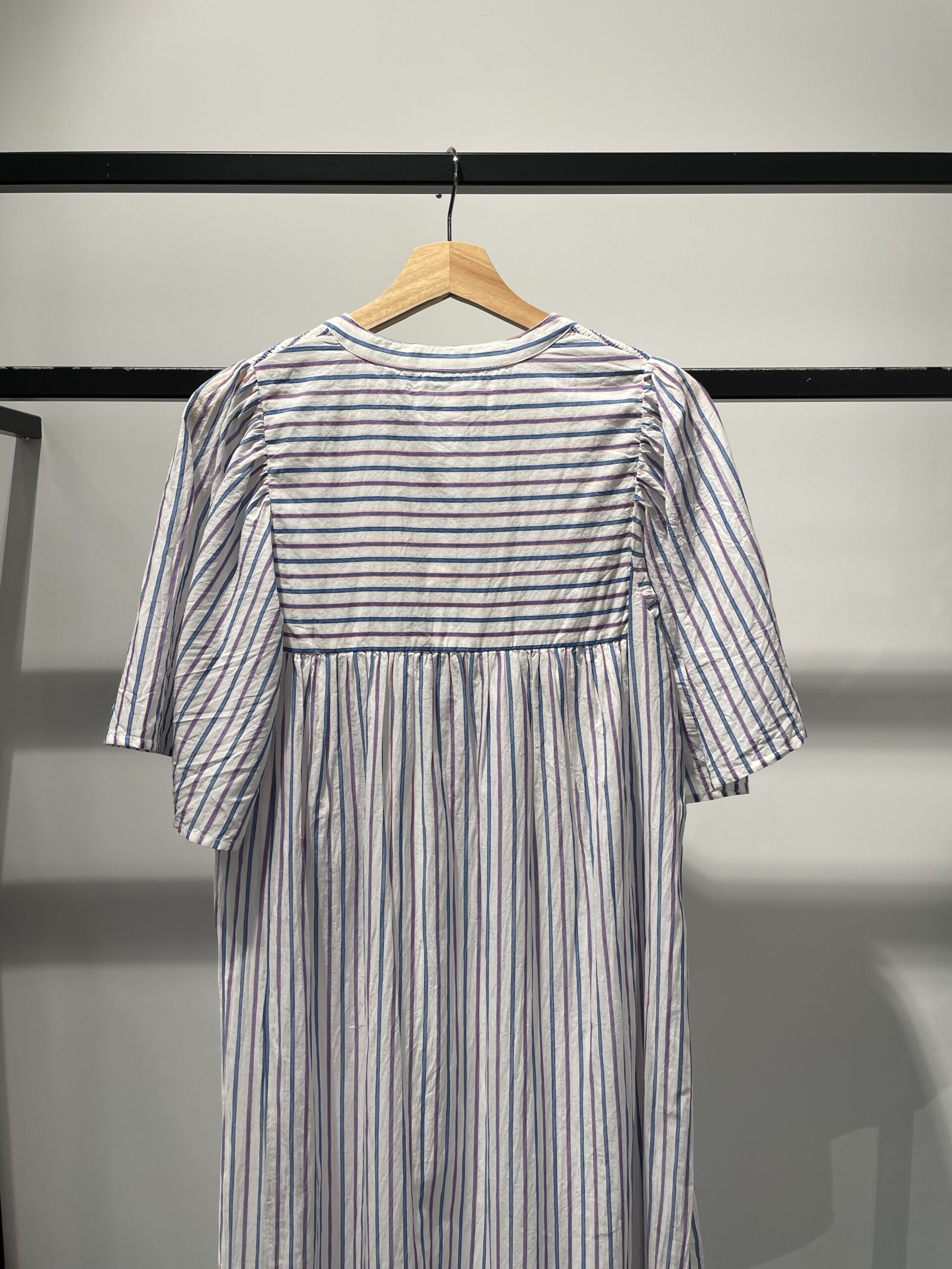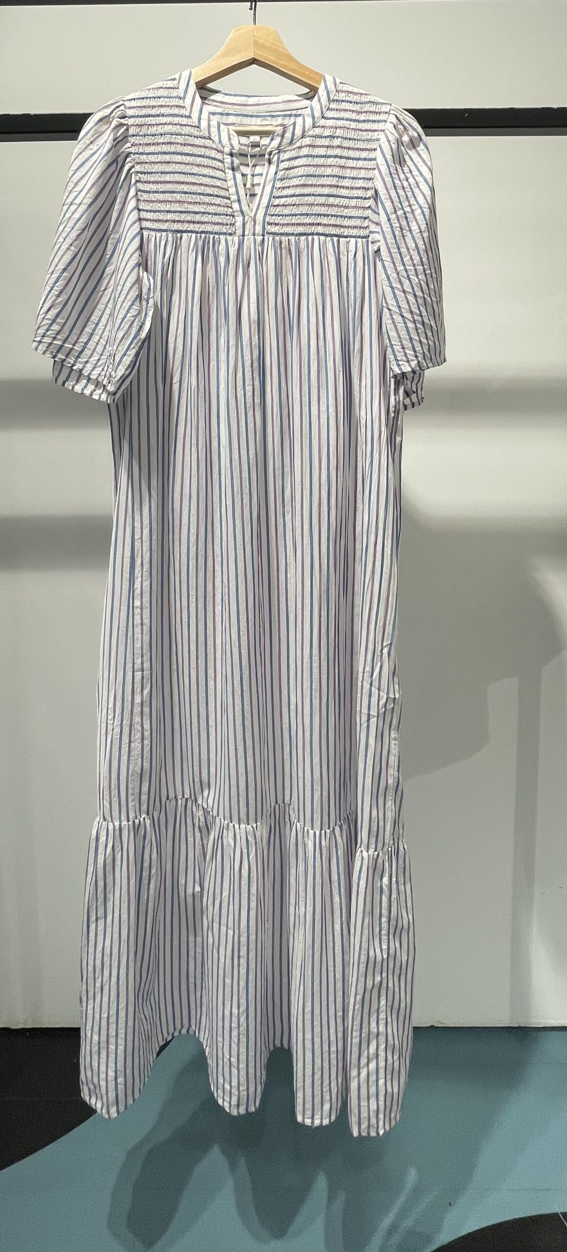Vestido de rayas marineras con fruncido en la parte del pecho y cuello mao abierto, largo con volante en el bajo y en las mangas, un vestido ideal 🛟